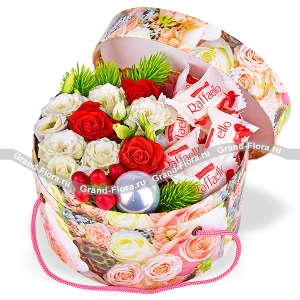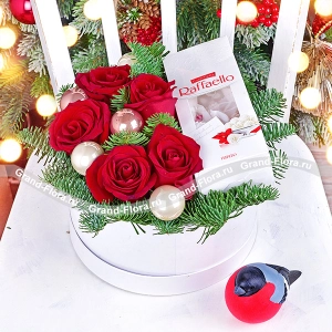 Зимняя сказка - коробка с розами и конфетами рафаэлло