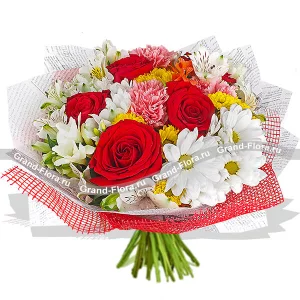 С любовью и нежностью - букет из кустовых хризантем, роз и альстромерий