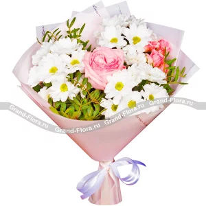Улыбка весны – букет с кустовыми розами и хризантемами