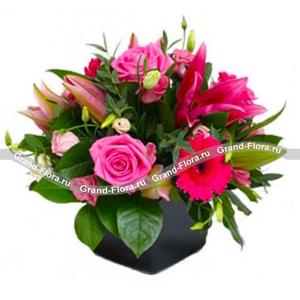Стандартный: розы розовые - 7 шт., герберы розовые - 5 шт., лилии розовые - 2 шт., эустома розовая - 7 шт., декоративная зелень, оазис.