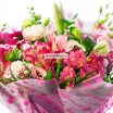 лилия розовая -  1 шт, альстромерия розовая - 3 шт, эустома розовая - 3 шт, эустома белая  -  1 шт, декоративная зелень, фетр розовый. Примерный диаметр букета 20х20см.