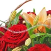 Уменьшенный: роза красная - 5 шт., лилия желтая (по сезону. возможна замена на белую) - 1 шт., хризантема одноголовая зеленая - 2 шт., салал, папоротник - 4 шт., оазис, корзина.