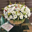 ДЕЛЮКС: хризантема кустовая ромашковая белая - 25 шт., солидаго - 10 шт.(возможна замена на декоративную зелень), оазис, сердечки маленькие красные (декоративные) - 9 шт., корзина большая.