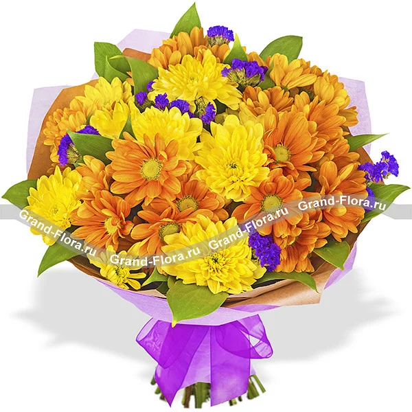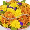 Стандартный: хризантема кустовая жёлтая - 4 шт., хризантема кустовая оранжевая/розовая - 3 шт., статица - 3 шт., салал, крафт.
