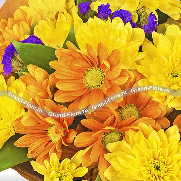 Стандартный: хризантема кустовая жёлтая - 4 шт., хризантема кустовая оранжевая - 3 шт., статица - 3 шт., салал, крафт.