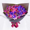 Уменьшенный: ирисы - 3 шт., хризантема кустовая фиолетовая - 1 шт., эустома розовая - 3 шт., тюльпан фиолетовый - 2 шт., статица, упаковка, лента. Примерный размер: 25Х25 см.