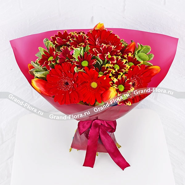 Стандартный: гербера красная - 4 шт., тюльпан красно-оранжевый - 6 шт., хризантема кустовая ромашковая бардовая - 3 шт., упаковка, лента.