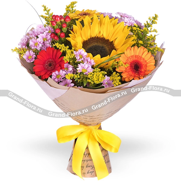Стандартный: подсолнух - 1 шт., хризантема кустовая ромашковая фиолетовая - 3 шт., герберы микс - 3 шт., гиперикум, декоративная зелень., упаковка, лента.