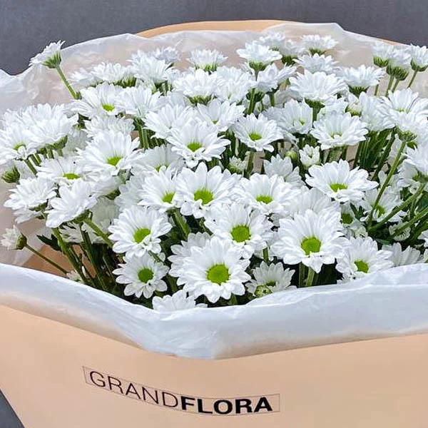 Белая кустовая ромашковидная хризантема (количество выбранное Вами), упаковка, лента